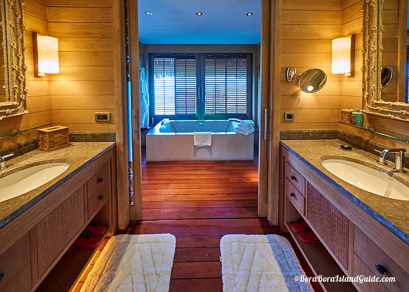 The huge bathroom - divided into 3 sections - had many thoughtful touches that gave a feeling of being pampered. The first morning we sat in the super-sized bath, windows wide open, marveling at the lagoon - in utter privacy!